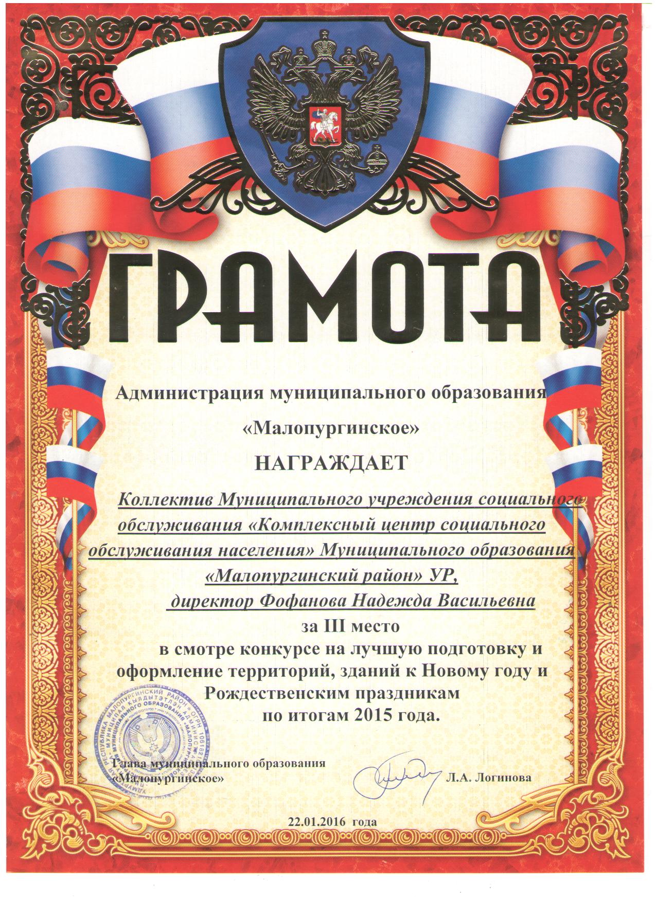 31.03.2016 года подводились итоги 2015 года МО «Малопургинское» по результатам которых коллективу КЦСОН Малопургинского района вручена Грамота за 3 место в смотре-конкурсе на лучшую подготовку и оформление территорий, зданий к Новому году и Рождественским праздникам.